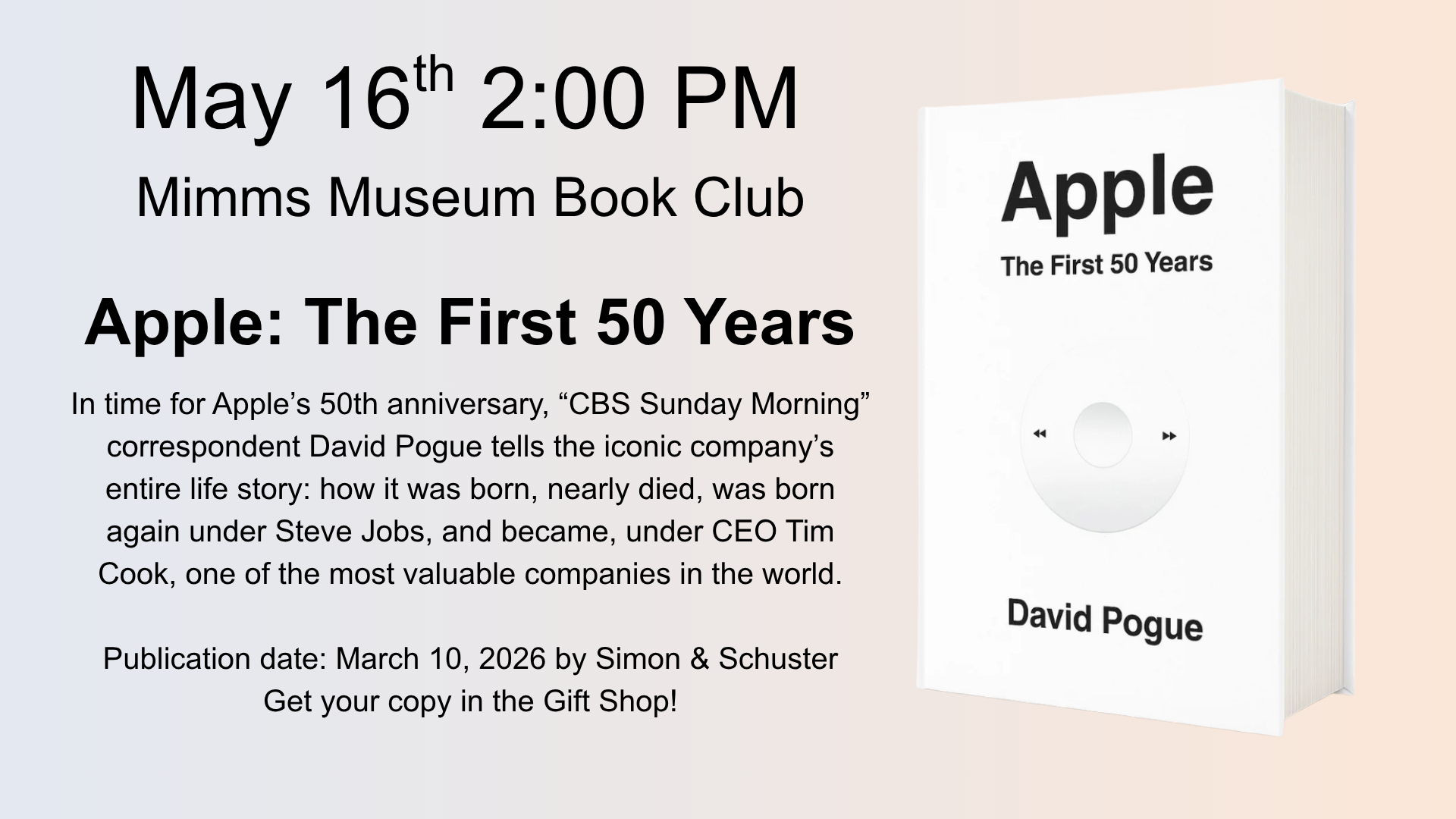 Book Club – Apple: The First 50 Years by David Pogue Join us on Saturday, May 16 at 2 PM at Mimms Museum for an engaging discussion of Apple’s history and impact. Celebrate five decades of innovation with our Book Club selection, Apple: The First 50 Years by David Pogue. Support the museum and pick...