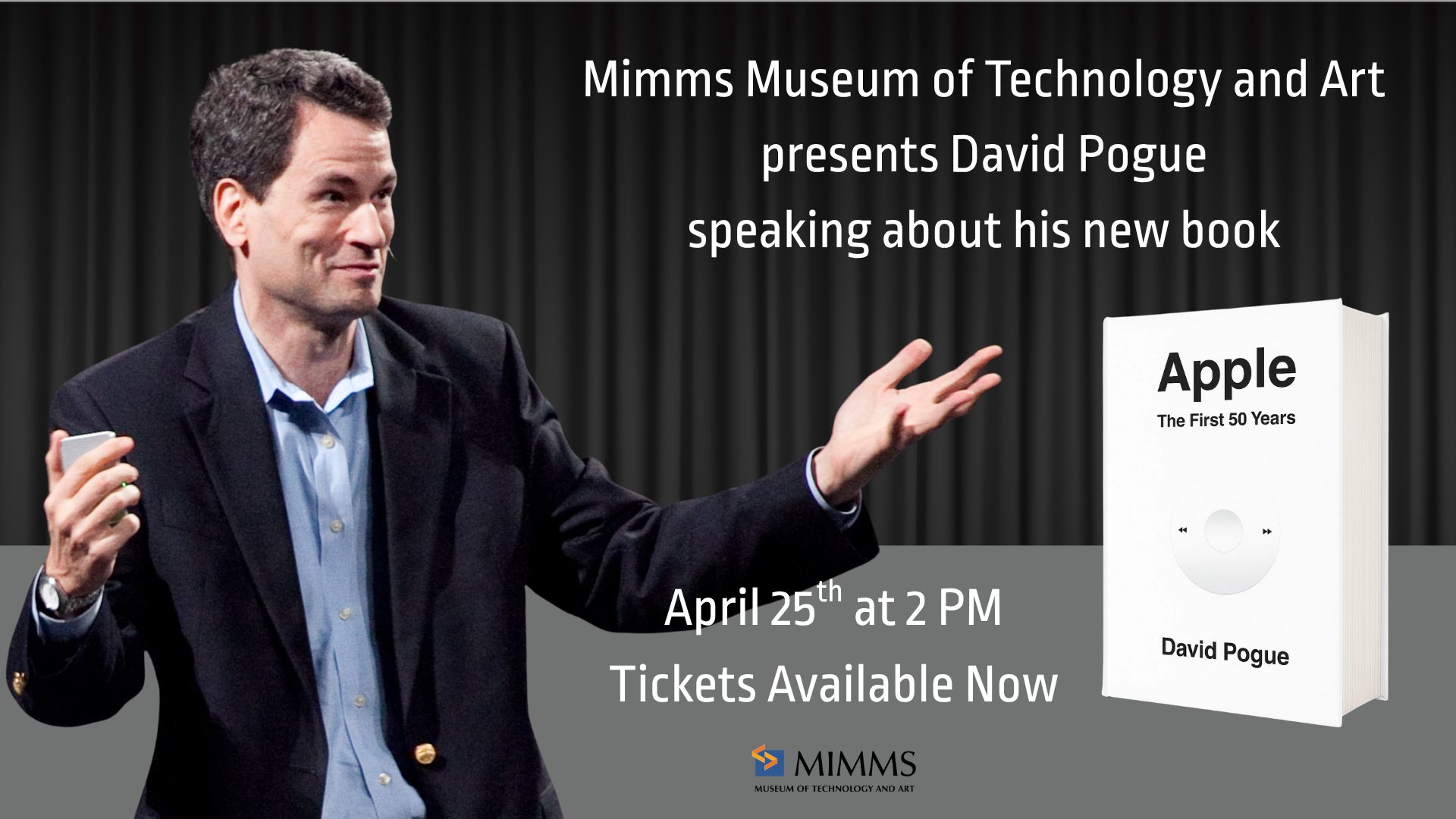 Mimms Museum of Technology and Art is excited to present David Pogue. Date & Time: Saturday, April 25 at 2:00 PM Tickets are available now via this link.Doors Open: 1:30 PMLocation: Aurora Cineplex Join us for a special presentation with David Pogue—Emmy-winning CBS News correspondent, New York Times bestselling author, and one of the most...