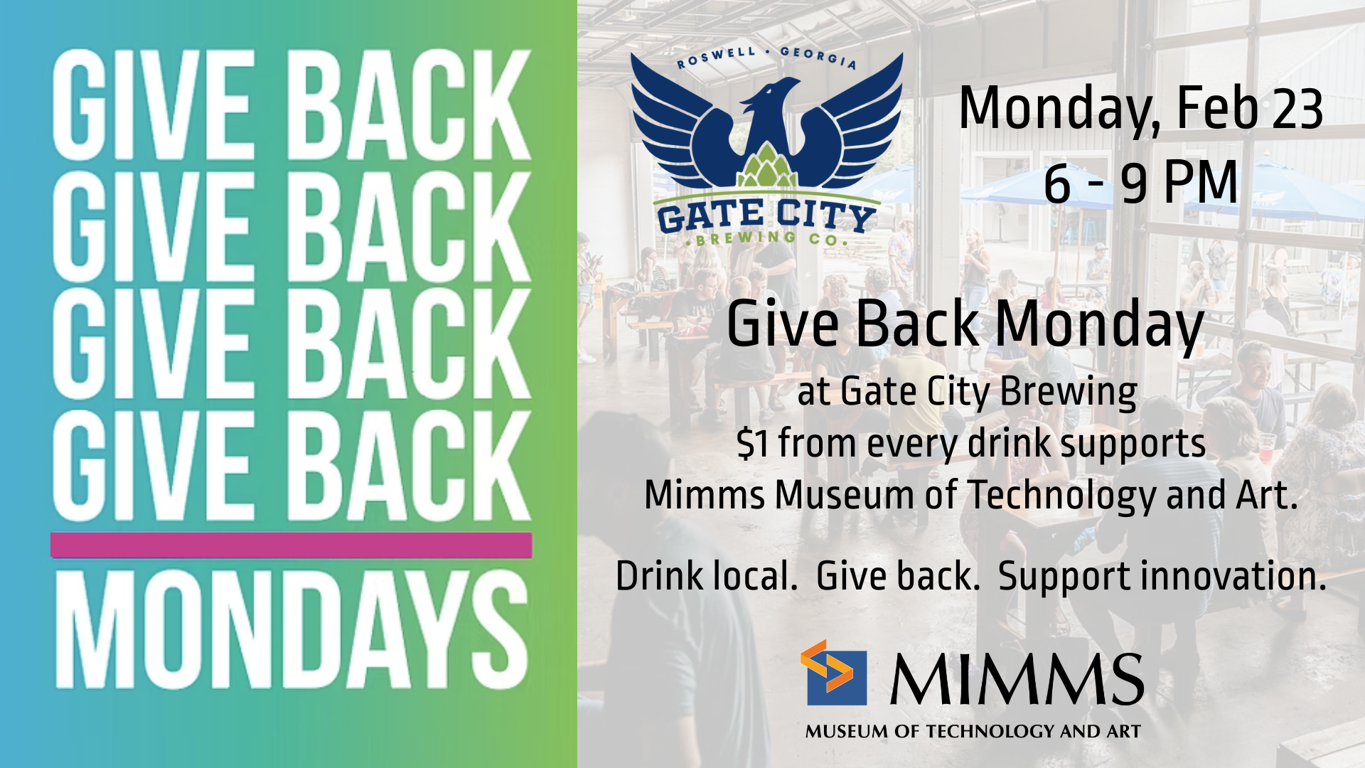 Raise a glass for a great cause! Join us for Give Back Monday at Gate City Brewing Company, where $1 from every drink sold will be donated to the Mimms...